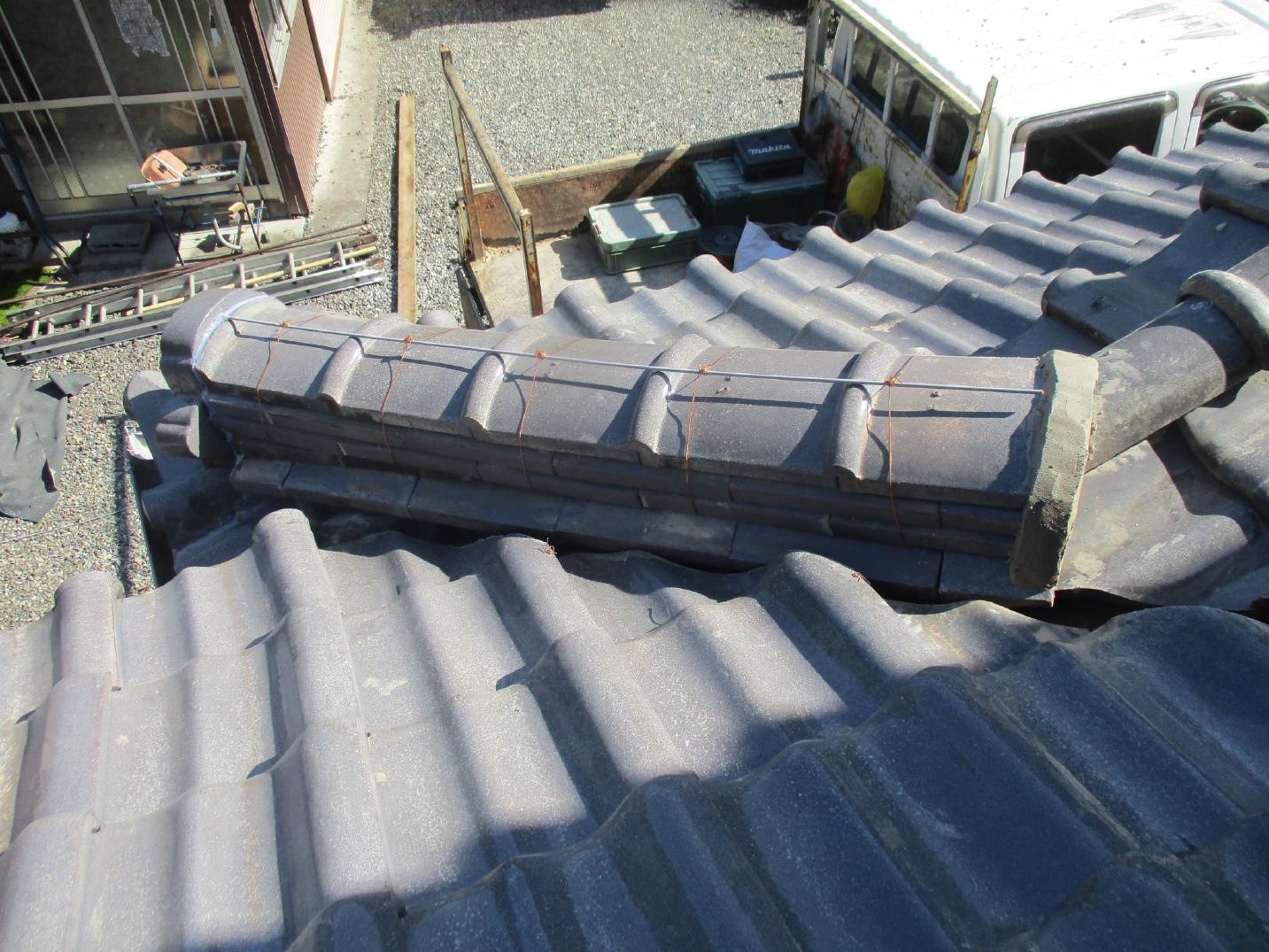 | 抜け落ちて落下しそうになっていた瓦、これで安心です。 | こちらの棟もしっかりと積み直し、針金で補強、鬼瓦の部分の隙間もシリコンをつかい固定しました。 |